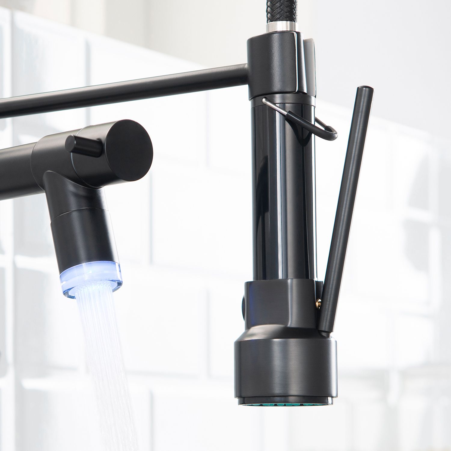 LED Commercial Kitchen Faucet with Pull Down Sprayer, Single Handle Single Lever Kitchen Sink FaucetCONVENIENT DUAL-FUNCTION SETTINGS - Enhance your experience even further by using the 360 degree rotate and dual-function setting. The setting lets you choose between the stream or spray to make it easier than ever to wash your hands, dishes, or anything else. You can also easily adjust the water pressure and temperature using the single handle attachment!EASY TO CLEAN - Matte black surface resists fingerprints and corrosion. Dirt cannot be absorbed on the surface of the faucet, and cloth can be used for daily cleaning.High Arch Spout Design with 360-degree Rotation: Long neck design such as gooseneck, offers more room for a variety of sink activities, for kitchen, laundry room, farmhouse, restaurant,camper and trailer