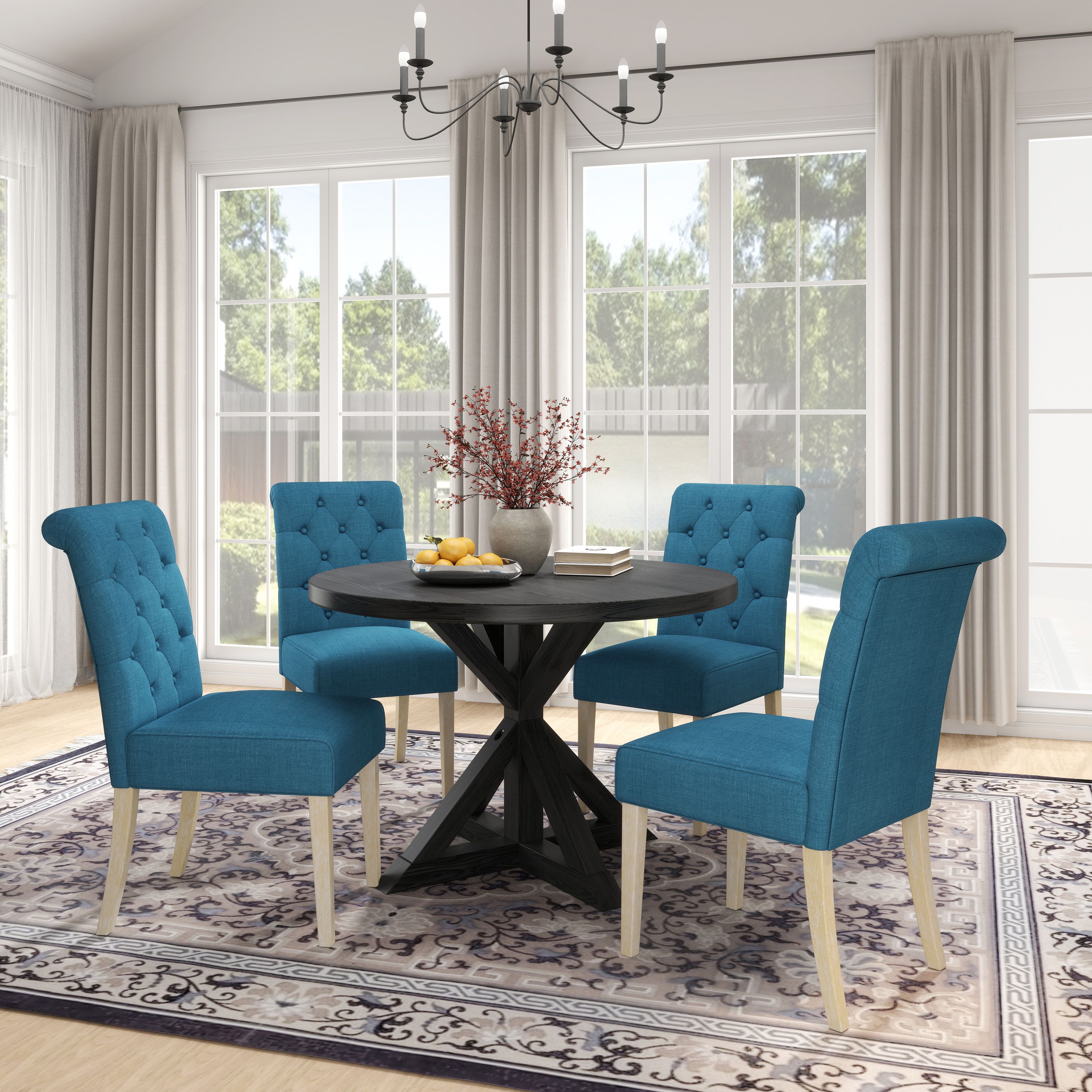 Banff 5-piece Dining Set, Cross-Buck Round Table with 4 Tufted Chairs, Blue Banff 5-piece Dining Set, Cross-Buck Round Table with 4 Tufted Chairs, Blue Banff 5-piece Dining Set, Cross-Buck Round Table with 4 Tufted Chairs, Blue