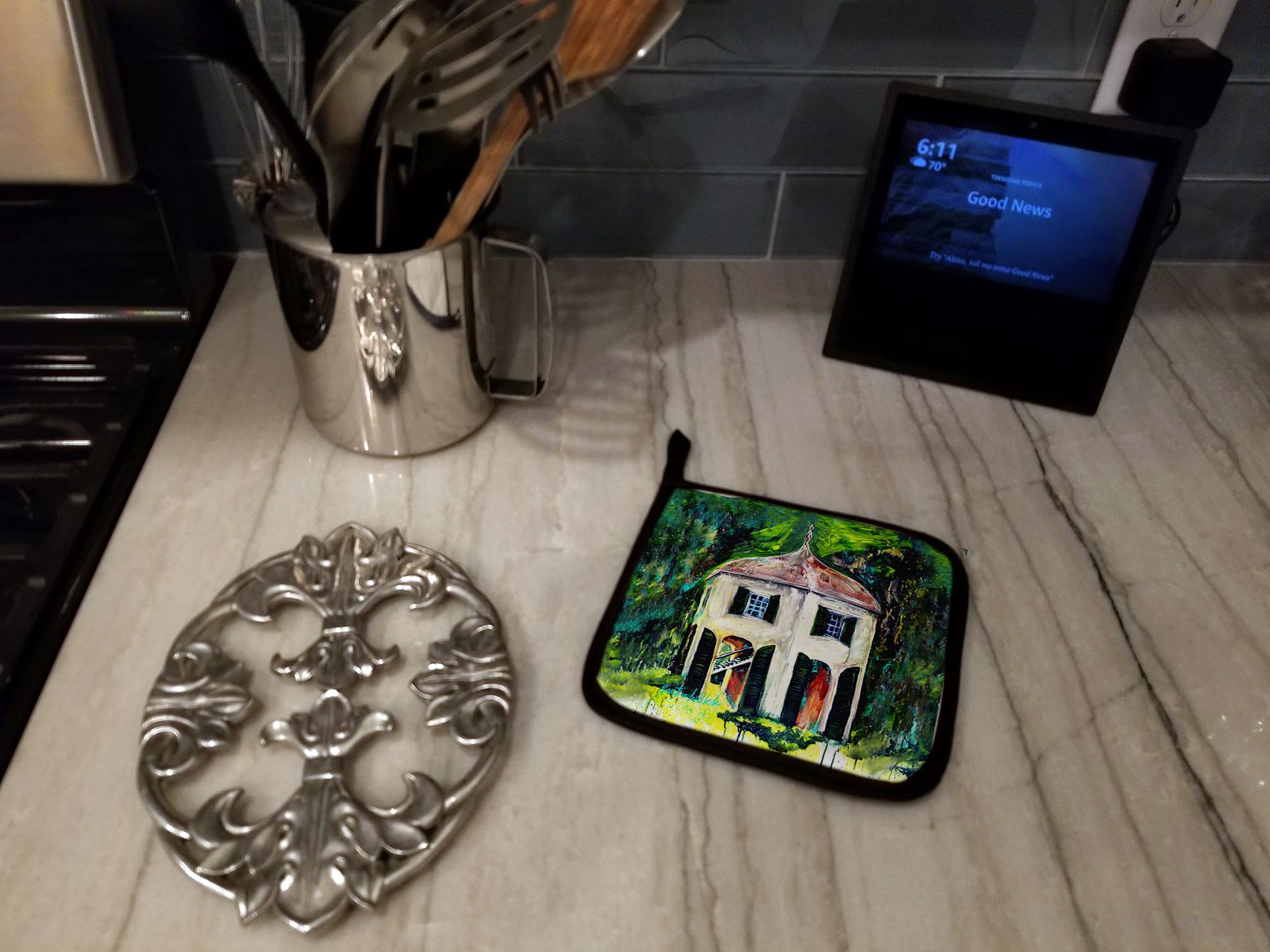 1.Full color Pair of decorative Pot Holders to match your kitchen decor. Each set of potholders contains two potholders that measure 7 1/2 inches by 7 1/2 inches and has a hanger sewn into one side.